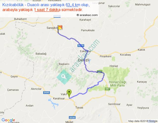 Kızılcabölük - Duacılı arası yaklaşık olarak 90 km/h ile yukarıda belirtilen sürede olup, iki yerin kuş uçuşu uzaklığı (mesafesi) 32'dir. Yolculuk otobüsle 1 saat 27 dakika sürmektedir.
