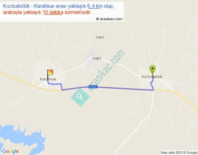 Kızılcabölük - Karahisar arası yaklaşık olarak 90 km/h ile yukarıda belirtilen sürede olup, iki yerin kuş uçuşu uzaklığı (mesafesi) 5'dir. Yolculuk otobüsle 13 dakika sürmektedir.