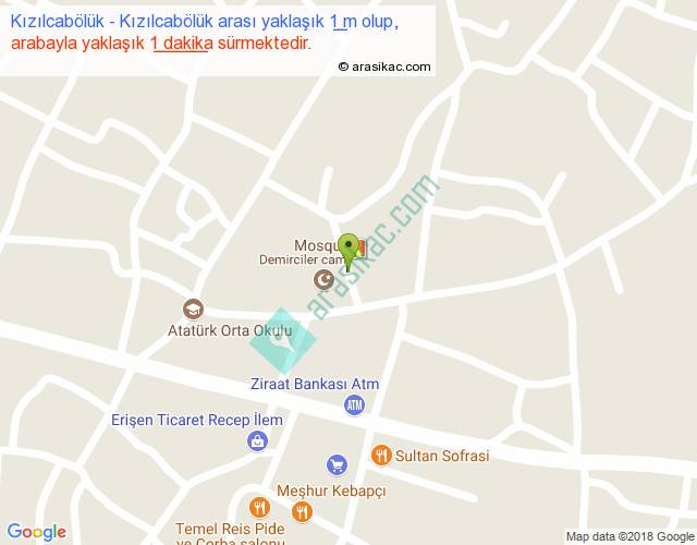 Kızılcabölük - Kızılcabölük arası yaklaşık olarak 90 km/h ile yukarıda belirtilen sürede olup, iki yerin kuş uçuşu uzaklığı (mesafesi) 0'dir. Yolculuk otobüsle 1 dakika sürmektedir.