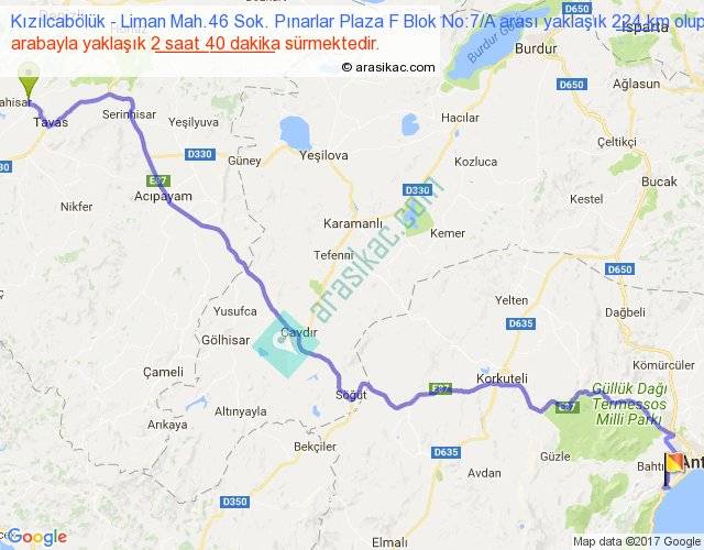 Kızılcabölük - Liman Mah.46 Sok. Pınarlar Plaza F Blok No:7 A arası yaklaşık olarak 90 km/h ile yukarıda belirtilen sürede olup, iki yerin kuş uçuşu uzaklığı (mesafesi) 164'dir. Yolculuk otobüsle 3 saat 28 dakika sürmektedir.