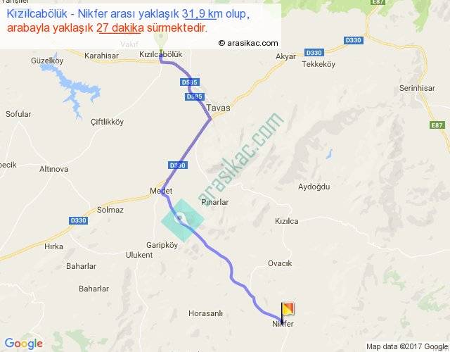 Kızılcabölük - Nikfer arası yaklaşık olarak 90 km/h ile yukarıda belirtilen sürede olup, iki yerin kuş uçuşu uzaklığı (mesafesi) 25'dir. Yolculuk otobüsle 35 dakika sürmektedir.