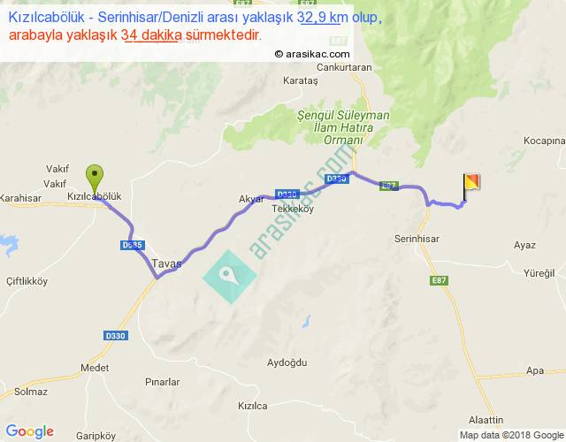 Kızılcabölük - Serinhisar Denizli arası yaklaşık olarak 90 km/h ile yukarıda belirtilen sürede olup, iki yerin kuş uçuşu uzaklığı (mesafesi) 25'dir. Yolculuk otobüsle 44 dakika sürmektedir.