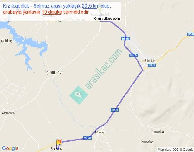Kızılcabölük - Solmaz arası yaklaşık olarak 90 km/h ile yukarıda belirtilen sürede olup, iki yerin kuş uçuşu uzaklığı (mesafesi) 14'dir. Yolculuk otobüsle 24 dakika sürmektedir.