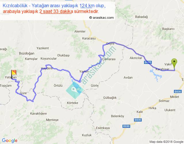 Kızılcabölük - Yatağan arası yaklaşık olarak 90 km/h ile yukarıda belirtilen sürede olup, iki yerin kuş uçuşu uzaklığı (mesafesi) 68'dir. Yolculuk otobüsle 3 saat 18 dakika sürmektedir.