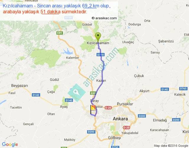 Kızılcahamam - Sincan arası yaklaşık olarak 90 km/h ile yukarıda belirtilen sürede olup, iki yerin kuş uçuşu uzaklığı (mesafesi) 56'dir. Yolculuk otobüsle 1 saat 6 dakika sürmektedir.