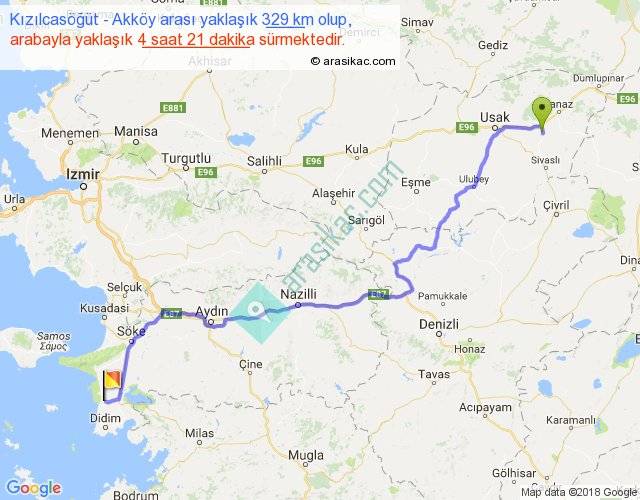 Kızılcasöğüt - Akköy arası yaklaşık olarak 90 km/h ile yukarıda belirtilen sürede olup, iki yerin kuş uçuşu uzaklığı (mesafesi) 245'dir. Yolculuk otobüsle 5 saat 39 dakika sürmektedir.