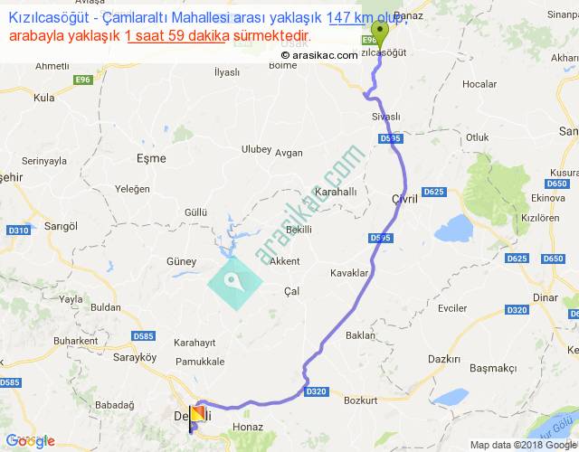 Kızılcasöğüt - Çamlaraltı Mahallesi arası yaklaşık olarak 90 km/h ile yukarıda belirtilen sürede olup, iki yerin kuş uçuşu uzaklığı (mesafesi) 112'dir. Yolculuk otobüsle 2 saat 34 dakika sürmektedir.