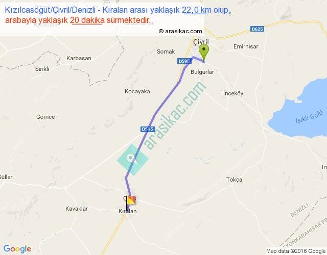 Kızılcasöğüt Çivril Denizli - Kıralan arası yaklaşık olarak 90 km/h ile yukarıda belirtilen sürede olup, iki yerin kuş uçuşu uzaklığı (mesafesi) 20'dir. Yolculuk otobüsle 26 dakika sürmektedir.