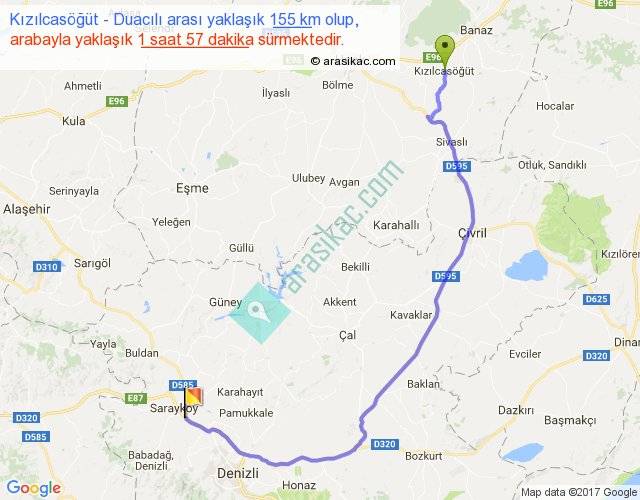 Kızılcasöğüt - Duacılı arası yaklaşık olarak 90 km/h ile yukarıda belirtilen sürede olup, iki yerin kuş uçuşu uzaklığı (mesafesi) 103'dir. Yolculuk otobüsle 2 saat 32 dakika sürmektedir.