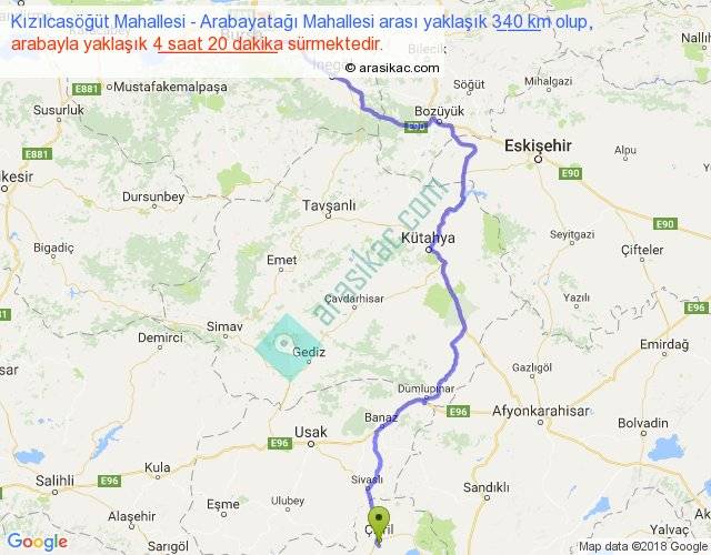 Kızılcasöğüt Mahallesi - Arabayatağı Mahallesi arası yaklaşık olarak 90 km/h ile yukarıda belirtilen sürede olup, iki yerin kuş uçuşu uzaklığı (mesafesi) 219'dir. Yolculuk otobüsle 5 saat 38 dakika sürmektedir.
