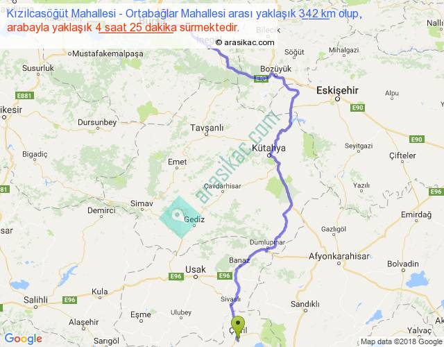 Kızılcasöğüt Mahallesi - Ortabağlar Mahallesi arası yaklaşık olarak 90 km/h ile yukarıda belirtilen sürede olup, iki yerin kuş uçuşu uzaklığı (mesafesi) 218'dir. Yolculuk otobüsle 5 saat 44 dakika sürmektedir.
