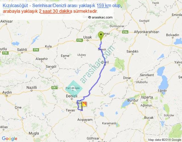 Kızılcasöğüt - Serinhisar Denizli arası yaklaşık olarak 90 km/h ile yukarıda belirtilen sürede olup, iki yerin kuş uçuşu uzaklığı (mesafesi) 119'dir. Yolculuk otobüsle 3 saat 15 dakika sürmektedir.