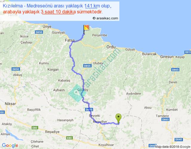 Kızılelma - Medreseönü arası yaklaşık olarak 90 km/h ile yukarıda belirtilen sürede olup, iki yerin kuş uçuşu uzaklığı (mesafesi) 74'dir. Yolculuk otobüsle 4 saat 7 dakika sürmektedir.