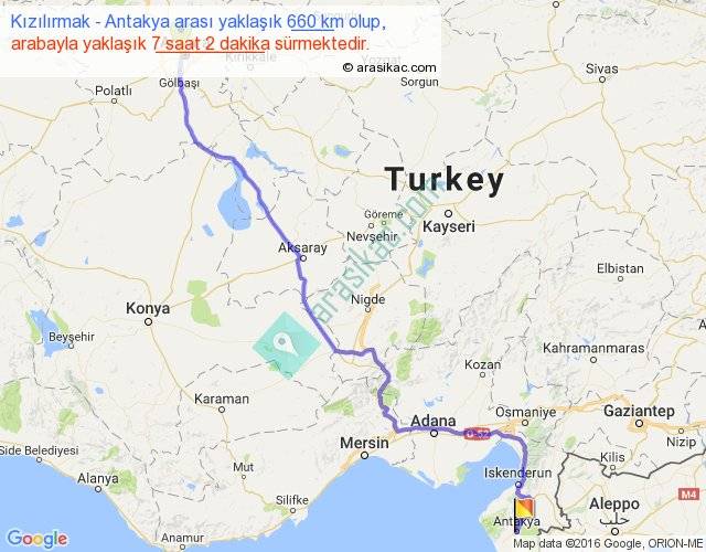 Kızılırmak - Antakya arası yaklaşık olarak 90 km/h ile yukarıda belirtilen sürede olup, iki yerin kuş uçuşu uzaklığı (mesafesi) 503'dir. Eğer belirtilen yerler arasında uçak seferi var ise bu süre uçakla 46 dakika'ya kadar düşebilir. Yolculuk otobüsle 9 saat 8 dakika sürmektedir.