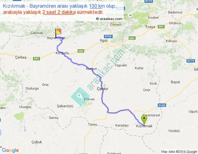 Kızılırmak - Bayramören arası yaklaşık olarak 90 km/h ile yukarıda belirtilen sürede olup, iki yerin kuş uçuşu uzaklığı (mesafesi) 93'dir. Yolculuk otobüsle 2 saat 38 dakika sürmektedir.