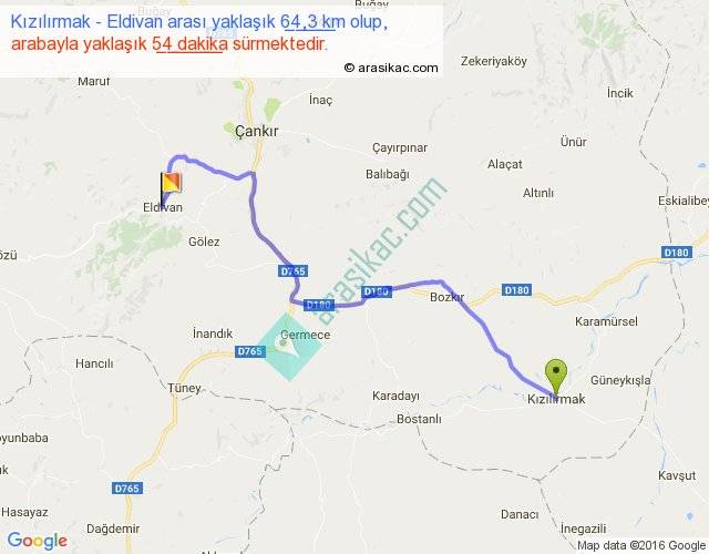 Kızılırmak - Eldivan arası yaklaşık olarak 90 km/h ile yukarıda belirtilen sürede olup, iki yerin kuş uçuşu uzaklığı (mesafesi) 46'dir. Yolculuk otobüsle 1 saat 10 dakika sürmektedir.