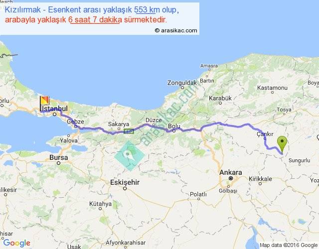 Kızılırmak - Esenkent arası yaklaşık olarak 90 km/h ile yukarıda belirtilen sürede olup, iki yerin kuş uçuşu uzaklığı (mesafesi) 452'dir. Eğer belirtilen yerler arasında uçak seferi var ise bu süre uçakla 41 dakika'ya kadar düşebilir. Yolculuk otobüsle 7 saat 57 dakika sürmektedir.