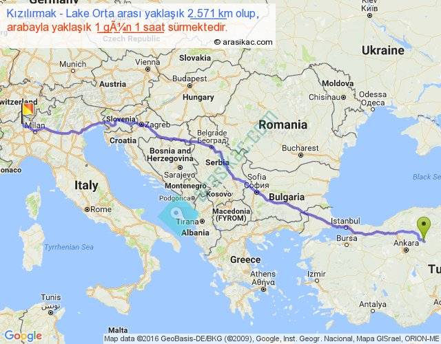 Kızılırmak - Lake Orta arası yaklaşık olarak 90 km/h ile yukarıda belirtilen sürede olup, iki yerin kuş uçuşu uzaklığı (mesafesi) 2142'dir. Eğer belirtilen yerler arasında uçak seferi var ise bu süre uçakla 3 saat 17 dakika'ya kadar düşebilir. Yolculuk otobüsle 1 gün 8 saat sürmektedir.