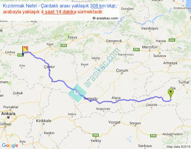 Kızılırmak Nehri - Çardaklı arası yaklaşık olarak 90 km/h ile yukarıda belirtilen sürede olup, iki yerin kuş uçuşu uzaklığı (mesafesi) 239'dir. Yolculuk otobüsle 5 saat 30 dakika sürmektedir.