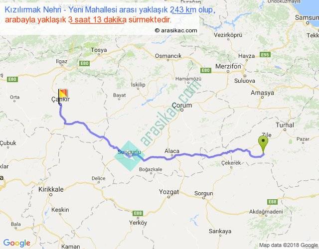 Kızılırmak Nehri - Yeni Mahallesi arası yaklaşık olarak 90 km/h ile yukarıda belirtilen sürede olup, iki yerin kuş uçuşu uzaklığı (mesafesi) 195'dir. Yolculuk otobüsle 4 saat 10 dakika sürmektedir.