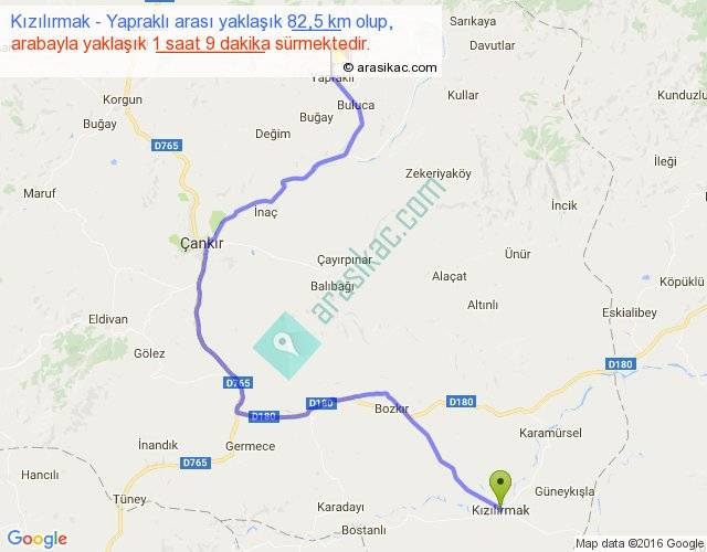 Kızılırmak - Yapraklı arası yaklaşık olarak 90 km/h ile yukarıda belirtilen sürede olup, iki yerin kuş uçuşu uzaklığı (mesafesi) 49'dir. Yolculuk otobüsle 1 saat 29 dakika sürmektedir.