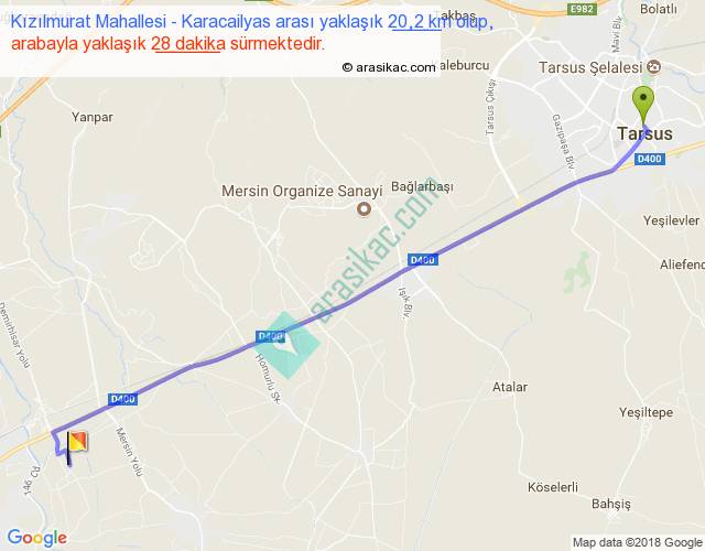 Kızılmurat Mahallesi - Karacailyas arası yaklaşık olarak 90 km/h ile yukarıda belirtilen sürede olup, iki yerin kuş uçuşu uzaklığı (mesafesi) 18'dir. Yolculuk otobüsle 36 dakika sürmektedir.
