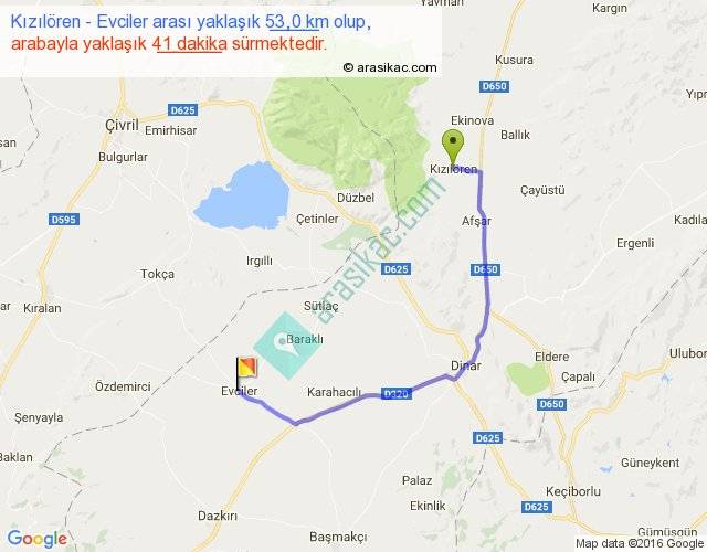 Kızılören - Evciler arası yaklaşık olarak 90 km/h ile yukarıda belirtilen sürede olup, iki yerin kuş uçuşu uzaklığı (mesafesi) 33'dir. Yolculuk otobüsle 53 dakika sürmektedir.