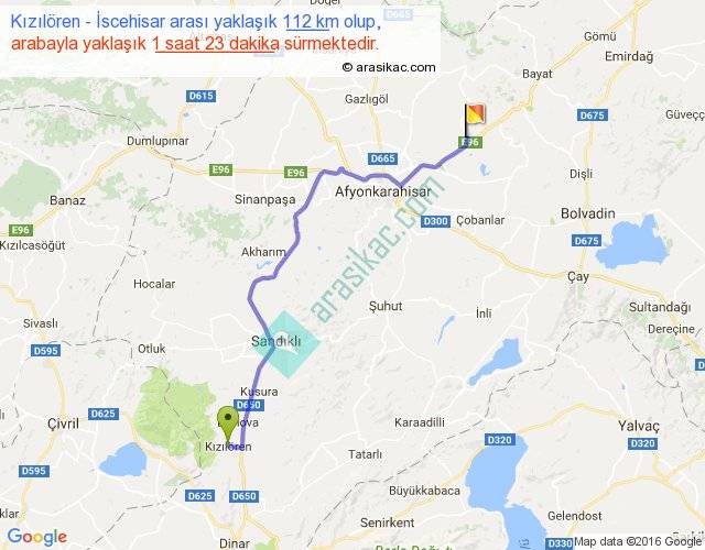 Kızılören - İscehisar arası yaklaşık olarak 90 km/h ile yukarıda belirtilen sürede olup, iki yerin kuş uçuşu uzaklığı (mesafesi) 84'dir. Yolculuk otobüsle 1 saat 47 dakika sürmektedir.