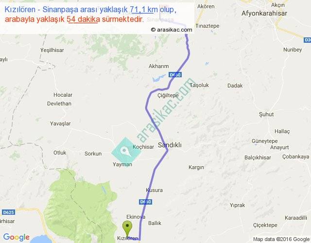 Kızılören - Sinanpaşa arası yaklaşık olarak 90 km/h ile yukarıda belirtilen sürede olup, iki yerin kuş uçuşu uzaklığı (mesafesi) 54'dir. Yolculuk otobüsle 1 saat 10 dakika sürmektedir.
