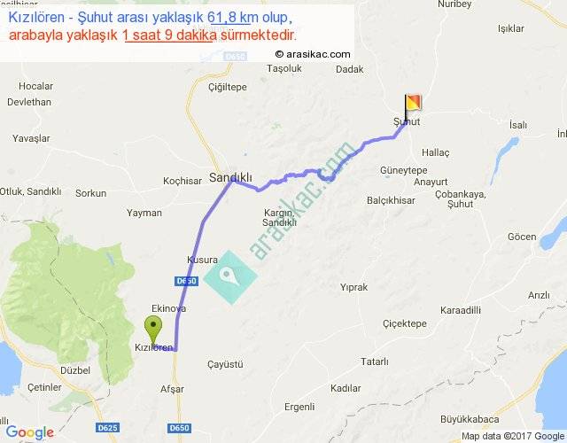 Kızılören - Şuhut arası yaklaşık olarak 90 km/h ile yukarıda belirtilen sürede olup, iki yerin kuş uçuşu uzaklığı (mesafesi) 46'dir. Yolculuk otobüsle 1 saat 28 dakika sürmektedir.