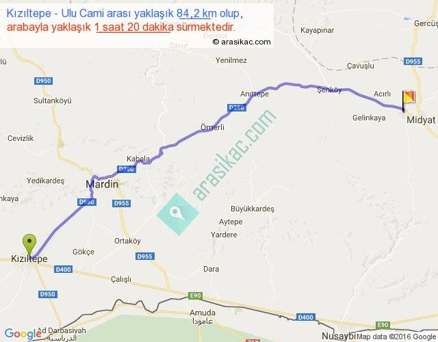 Kızıltepe - Ulu Cami arası yaklaşık olarak 90 km/h ile yukarıda belirtilen sürede olup, iki yerin kuş uçuşu uzaklığı (mesafesi) 71'dir. Yolculuk otobüsle 1 saat 44 dakika sürmektedir.