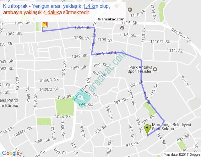 Kızıltoprak - Yenigün arası yaklaşık olarak 90 km/h ile yukarıda belirtilen sürede olup, iki yerin kuş uçuşu uzaklığı (mesafesi) 1'dir. Yolculuk otobüsle 5 dakika sürmektedir.