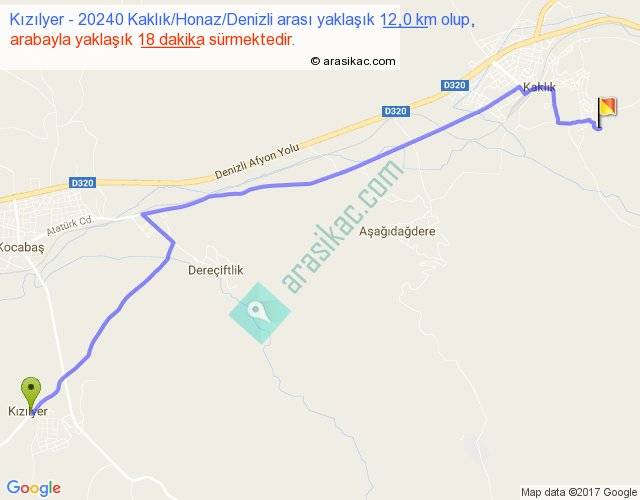 Kızılyer - 20240 Kaklık Honaz Denizli arası yaklaşık olarak 90 km/h ile yukarıda belirtilen sürede olup, iki yerin kuş uçuşu uzaklığı (mesafesi) 10'dir. Yolculuk otobüsle 23 dakika sürmektedir.