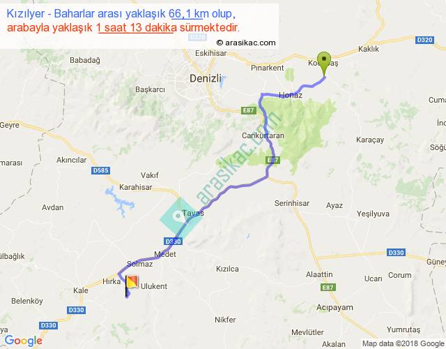 Kızılyer - Baharlar arası yaklaşık olarak 90 km/h ile yukarıda belirtilen sürede olup, iki yerin kuş uçuşu uzaklığı (mesafesi) 51'dir. Yolculuk otobüsle 1 saat 34 dakika sürmektedir.