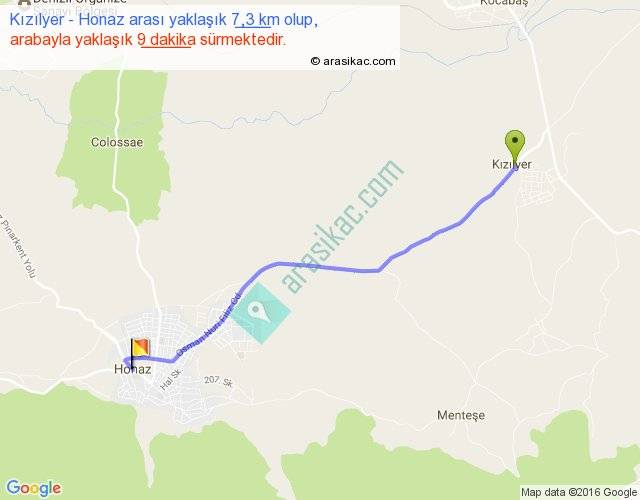 Kızılyer - Honaz arası yaklaşık olarak 90 km/h ile yukarıda belirtilen sürede olup, iki yerin kuş uçuşu uzaklığı (mesafesi) 6'dir. Yolculuk otobüsle 11 dakika sürmektedir.