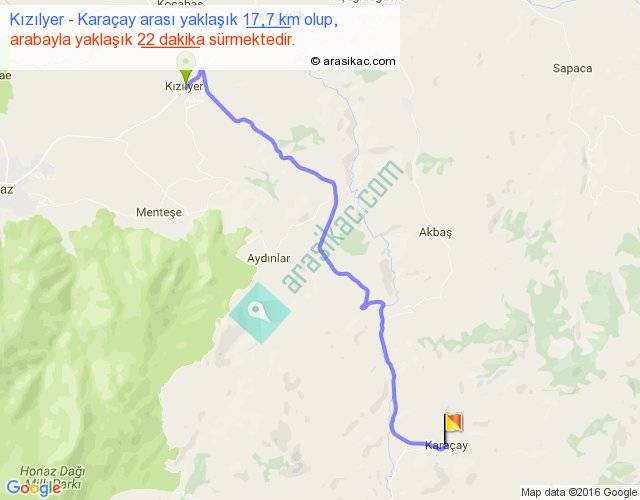 Kızılyer - Karaçay arası yaklaşık olarak 90 km/h ile yukarıda belirtilen sürede olup, iki yerin kuş uçuşu uzaklığı (mesafesi) 13'dir. Yolculuk otobüsle 28 dakika sürmektedir.