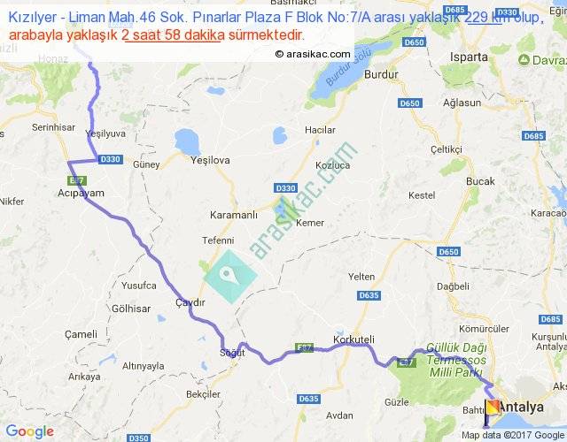 Kızılyer - Liman Mah.46 Sok. Pınarlar Plaza F Blok No:7 A arası yaklaşık olarak 90 km/h ile yukarıda belirtilen sürede olup, iki yerin kuş uçuşu uzaklığı (mesafesi) 153'dir. Yolculuk otobüsle 3 saat 51 dakika sürmektedir.