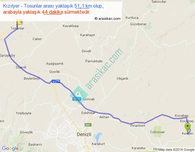 Kızılyer - Tosunlar arası yaklaşık olarak 90 km/h ile yukarıda belirtilen sürede olup, iki yerin kuş uçuşu uzaklığı (mesafesi) 39'dir. Yolculuk otobüsle 57 dakika sürmektedir.