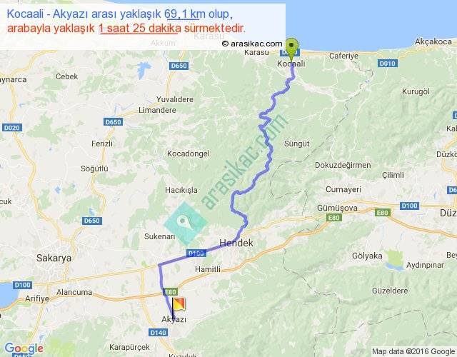 Kocaali - Akyazı arası yaklaşık olarak 90 km/h ile yukarıda belirtilen sürede olup, iki yerin kuş uçuşu uzaklığı (mesafesi) 45'dir. Yolculuk otobüsle 1 saat 50 dakika sürmektedir.