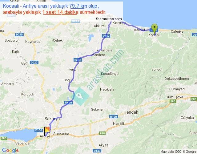 Kocaali - Arifiye arası yaklaşık olarak 90 km/h ile yukarıda belirtilen sürede olup, iki yerin kuş uçuşu uzaklığı (mesafesi) 56'dir. Yolculuk otobüsle 1 saat 36 dakika sürmektedir.