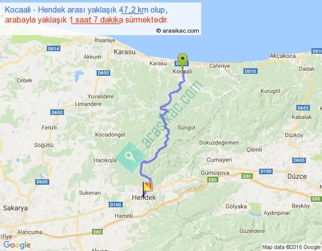 Kocaali - Hendek arası yaklaşık olarak 90 km/h ile yukarıda belirtilen sürede olup, iki yerin kuş uçuşu uzaklığı (mesafesi) 30'dir. Yolculuk otobüsle 1 saat 27 dakika sürmektedir.