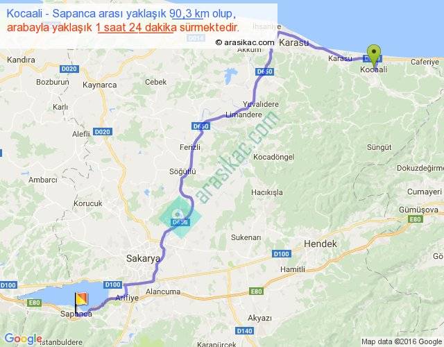 Kocaali - Sapanca arası yaklaşık olarak 90 km/h ile yukarıda belirtilen sürede olup, iki yerin kuş uçuşu uzaklığı (mesafesi) 64'dir. Yolculuk otobüsle 1 saat 49 dakika sürmektedir.