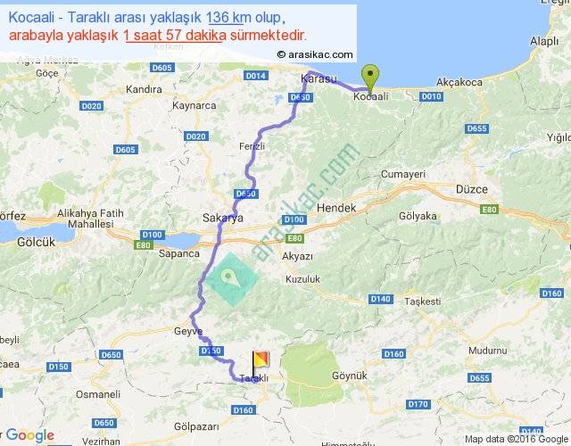 Kocaali - Taraklı arası yaklaşık olarak 90 km/h ile yukarıda belirtilen sürede olup, iki yerin kuş uçuşu uzaklığı (mesafesi) 79'dir. Yolculuk otobüsle 2 saat 32 dakika sürmektedir.