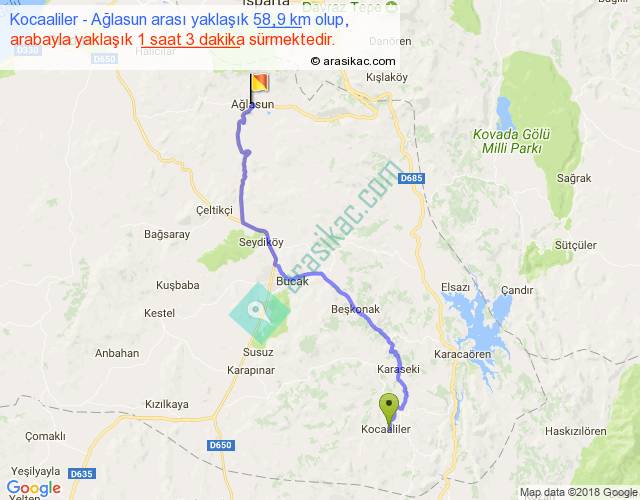 Kocaaliler - Ağlasun arası yaklaşık olarak 90 km/h ile yukarıda belirtilen sürede olup, iki yerin kuş uçuşu uzaklığı (mesafesi) 43'dir. Yolculuk otobüsle 1 saat 21 dakika sürmektedir.