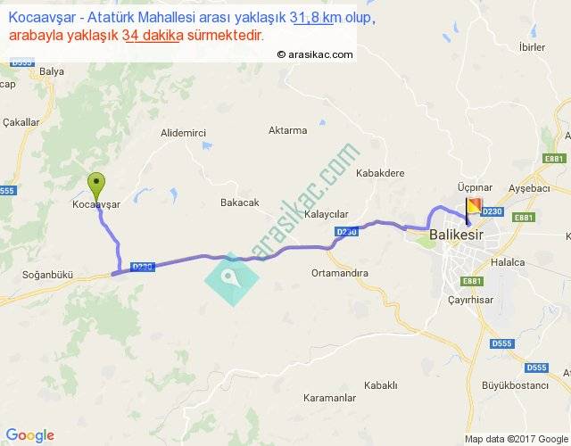 Kocaavşar - Atatürk Mahallesi arası yaklaşık olarak 90 km/h ile yukarıda belirtilen sürede olup, iki yerin kuş uçuşu uzaklığı (mesafesi) 24'dir. Yolculuk otobüsle 44 dakika sürmektedir.
