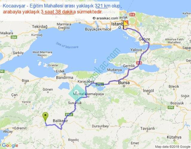 Kocaavşar - Eğitim Mahallesi arası yaklaşık olarak 90 km/h ile yukarıda belirtilen sürede olup, iki yerin kuş uçuşu uzaklığı (mesafesi) 189'dir. Yolculuk otobüsle 4 saat 43 dakika sürmektedir.