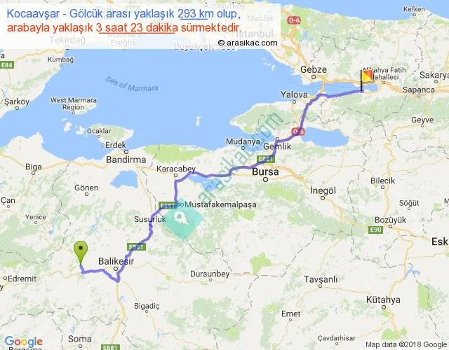 Kocaavşar - Gölcük arası yaklaşık olarak 90 km/h ile yukarıda belirtilen sürede olup, iki yerin kuş uçuşu uzaklığı (mesafesi) 219'dir. Yolculuk otobüsle 4 saat 23 dakika sürmektedir.