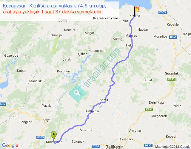Kocaavşar - Kızıksa arası yaklaşık olarak 90 km/h ile yukarıda belirtilen sürede olup, iki yerin kuş uçuşu uzaklığı (mesafesi) 59'dir. Yolculuk otobüsle 2 saat 6 dakika sürmektedir.