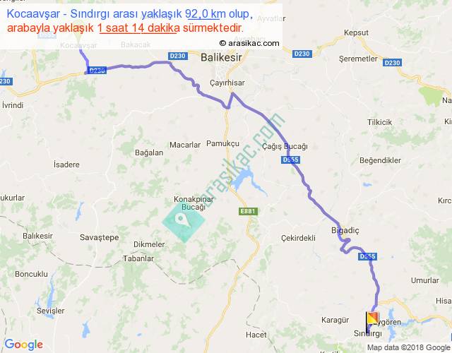 Kocaavşar - Sındırgı arası yaklaşık olarak 90 km/h ile yukarıda belirtilen sürede olup, iki yerin kuş uçuşu uzaklığı (mesafesi) 68'dir. Yolculuk otobüsle 1 saat 36 dakika sürmektedir.