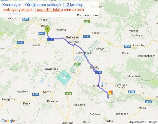 Kocaavşar - Yüreğil arası yaklaşık olarak 90 km/h ile yukarıda belirtilen sürede olup, iki yerin kuş uçuşu uzaklığı (mesafesi) 83'dir. Yolculuk otobüsle 2 saat 10 dakika sürmektedir.